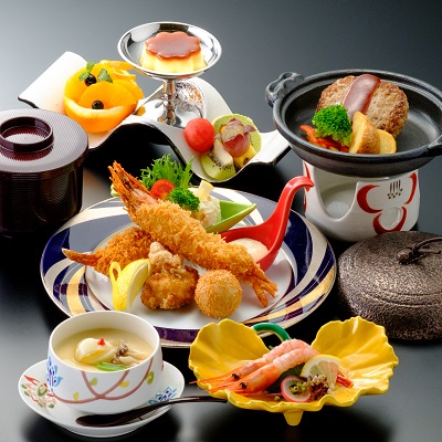 ご飯、お造り、揚げ物盛り合わせ(から揚げ等)、ハンバーグ、茶碗蒸し、デザートのお子様の好きなメニューです。