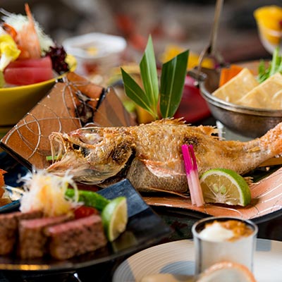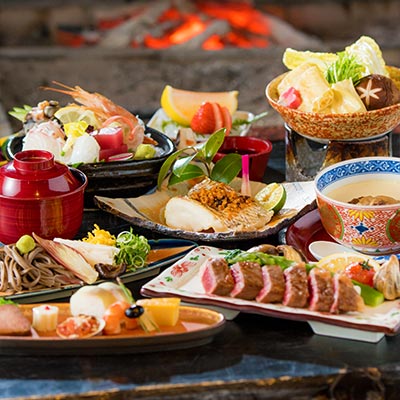 各コースとも、メイン料理の「東伯和牛」「大山地鶏」「日本海水揚げ旬の魚介」「活鮑(あわび)」をはじめ、山陰の自然の恵みをたっぷりご堪能いただける至高の旬づくしのお献立です。