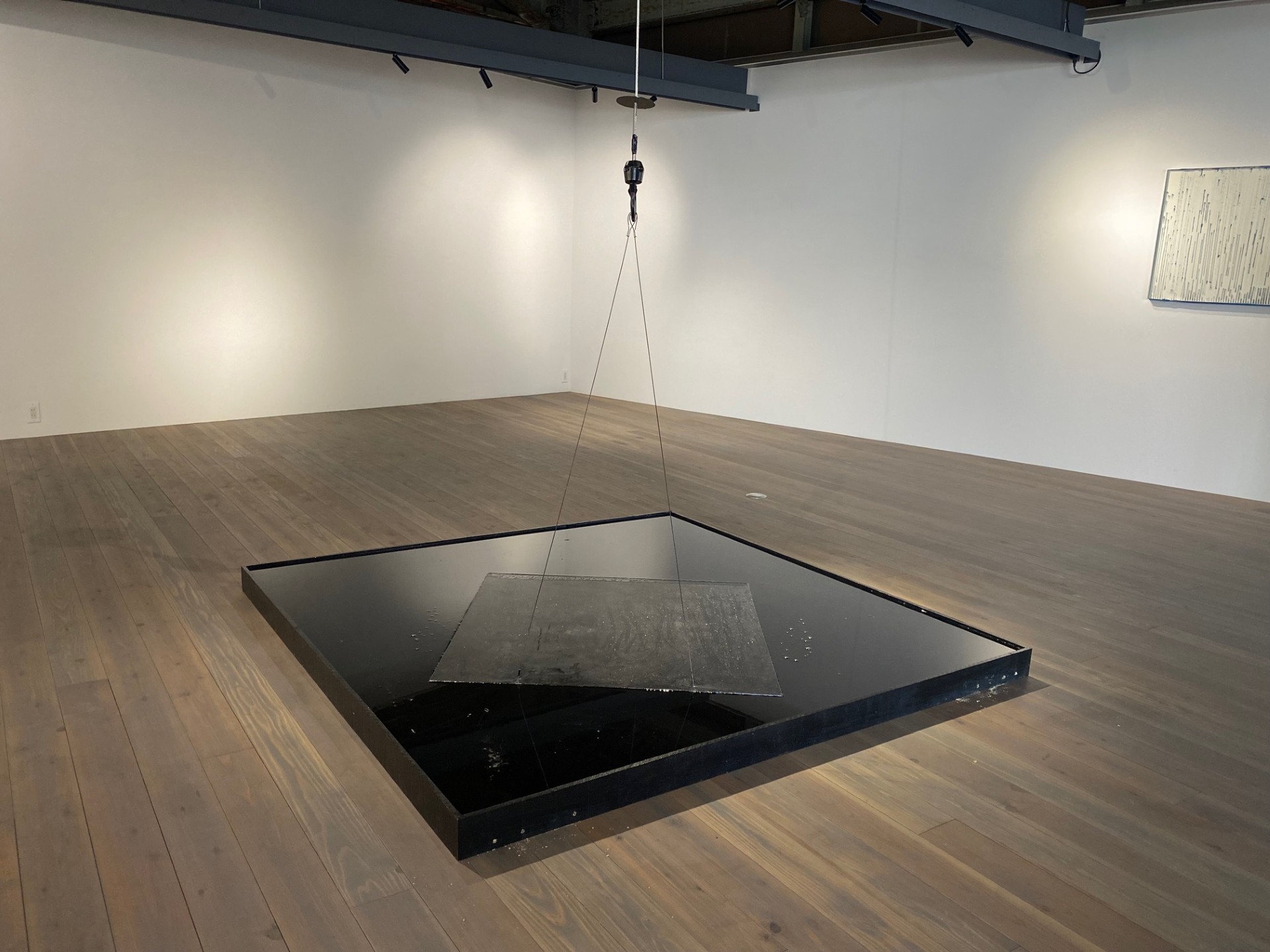 黒い水面の上に板が吊られている、大きな作品です。