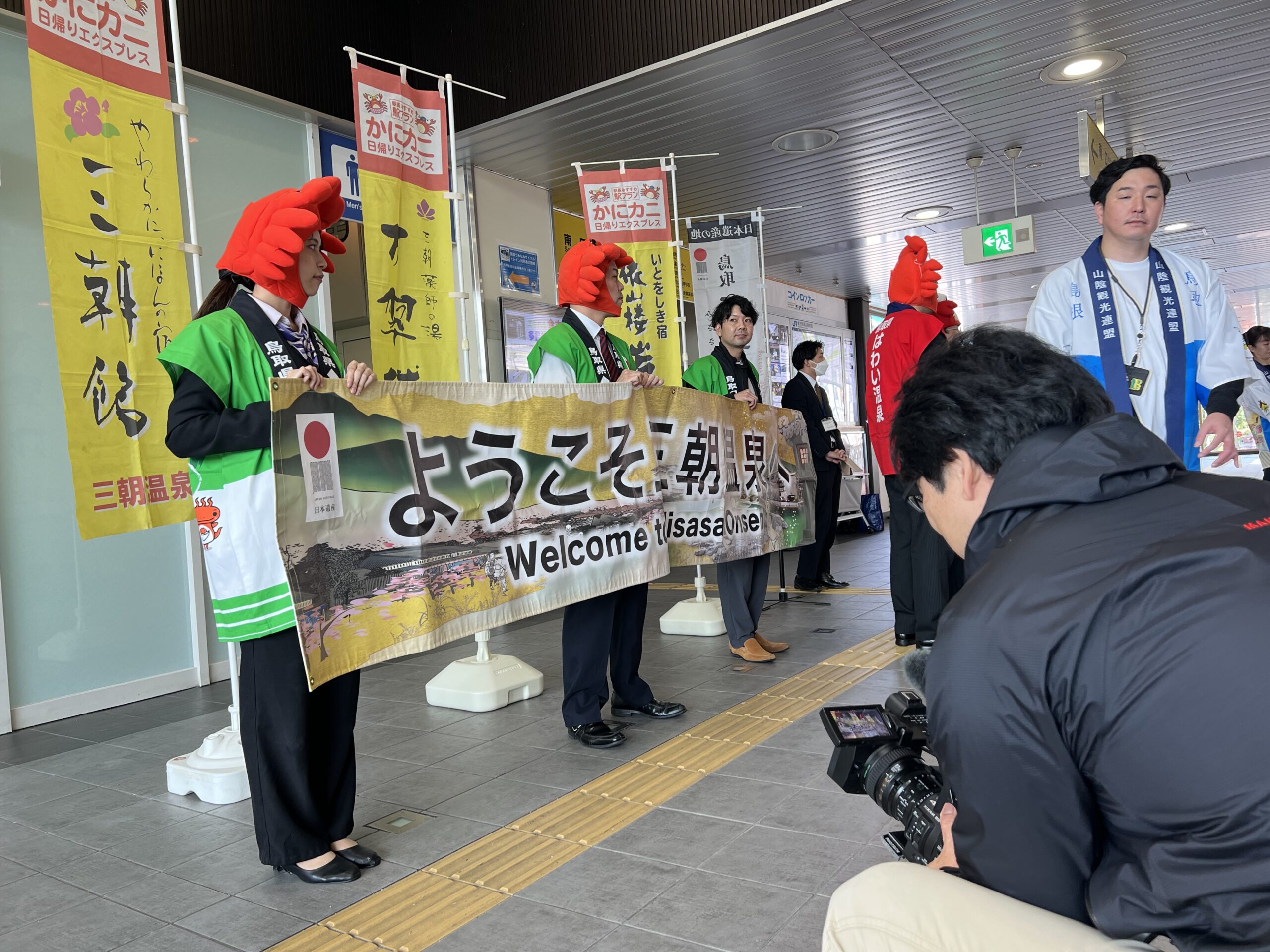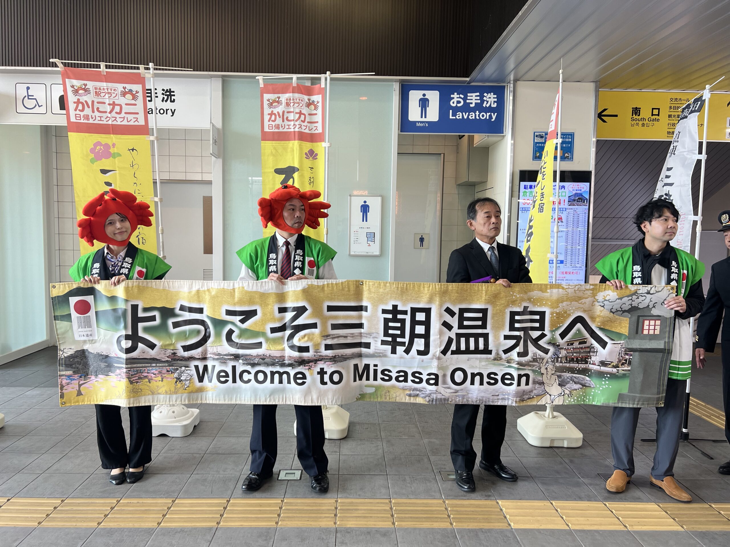 それに伴い、三朝温泉、はわい温泉の各旅館からスタッフが三朝温泉の最寄り駅の